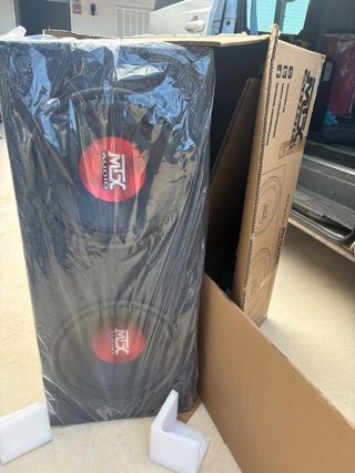 Dos altavoces medidas 50x28x23 cm. Carcasa de madera Woofer+Subwoofer+tweeter Ambos con rejilla protectora (en una foto está extraida para mostrar interior)