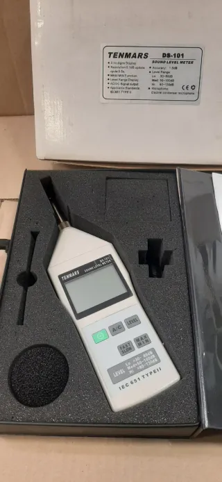 Sonómetro digital TENMARS DS-101. - Pantalla de 3 1/2 dígitos. - Resolución de 0.1dB. - Función MAX/MIN. - Rango de nivel de visualización. - Salida de señal AC/DC. - Micrófono de condensador electret.