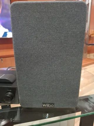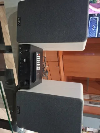Sistema de sonido Wibo con amplificador y dos altavoces. - Amplificador compacto. - Dos altavoces con acabado en tela. - Incluye control remoto.