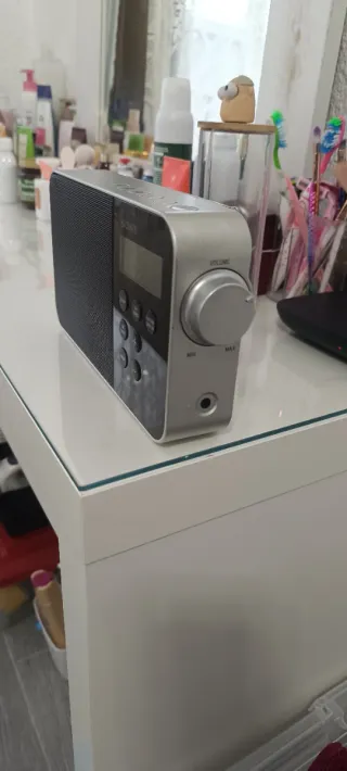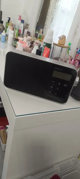 Radio portátil de la marca Sony, con un diseño moderno y compacto. - Altavoz frontal. - Pantalla digital. - Botones de control.