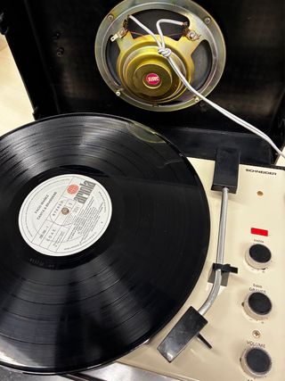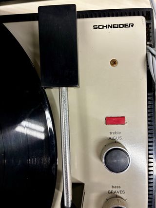 Tocadiscos antiguo de la marca Schneider en color beige y negro, para repasar, gira pero lento - Incluye altavoz integrado. - Controles de volumen, graves y agudos.