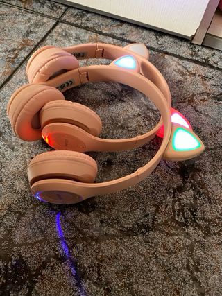 Audífonos con diseño divertido de orejas de gato que se iluminan. - Orejas con luces LED. - Color rosa. - Diseño llamativo. -Remato los dos juntos porque mis hijas no lo usan pero funcionan bien