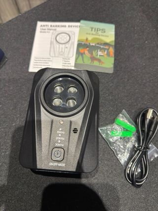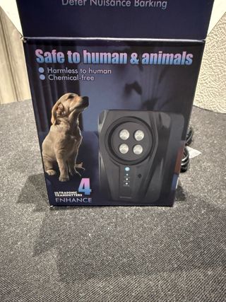 Dispositivo para disuadir ladridos molestos. Es seguro para humanos y animales. - Inofensivo para humanos. - Libre de químicos. - 4 transmisores ultrasónicos.
