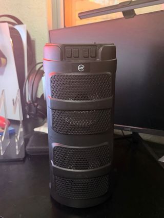 Se vende esta fantástica torre de sonido. Es un dispositivo imponente y vistoso. - Dispone de conectividad Bluetooth. - Incluye varios altavoces. - Tiene una pantalla digital para mostrar información. - Se controla mediante botones en la parte superior.