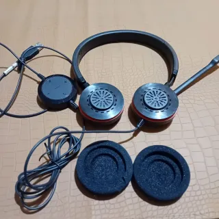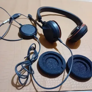 Auriculares Jabra Evolve 20 con micrófono y control en cable (volumen, mute, descuelgue). Probados: funcionan bien (audio y micro OK). Ideales para teletrabajo, Teams/Zoom y llamadas. Conexión USB (PC) Micrófono con brazo flexible Incluye 2 almohadillas de recambio (ver foto) Estado: usado, con señales normales de uso
