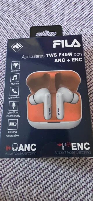Auriculares inalámbricos Fila TWS F45W con cancelación de ruido. - Conectividad inalámbrica. - Función de música. - Permiten realizar llamadas. - Micrófono incorporado. - Batería recargable. - Cancelación activa de ruido (ANC). - Cancelación de ruido ambiental (ENC). Nuevos a entrenar. No se han utizado. Solo para ver que funcionan correctamente, que por cierto se escuchan muy bien.