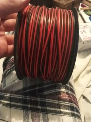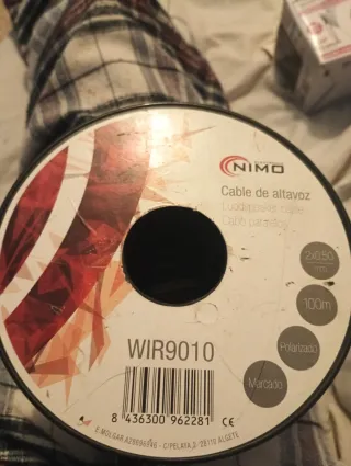 Rollo de cable para altavoces de la marca NIMO, modelo WIR9010. - Longitud: 100 metros. - Sección: 2x0.50 mm. - Cable polarizado y marcado.
