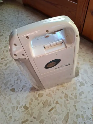 Radio cassette portátil en tonos beige y blanco. Un clásico para disfrutar de tu música. - Diseño compacto y con asa. - Botones de control de cinta. - Sintonizador AM/FM. - Lampara para iluminación.