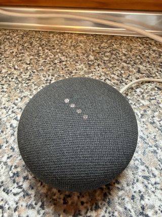 Altavoz inteligente Google Home Mini en color negro, casi a estrenar. Incluye su cargador original. - Diseño compacto y moderno. - Tejido texturizado en la parte superior. - Muy poco uso