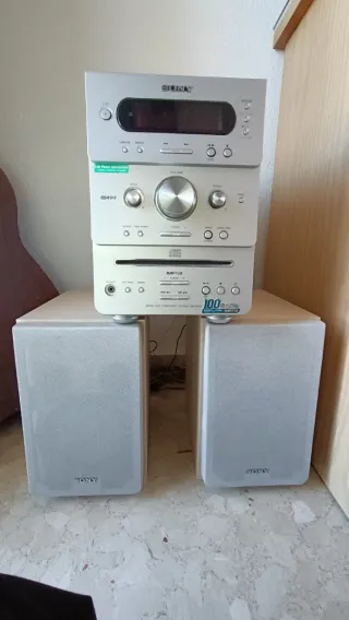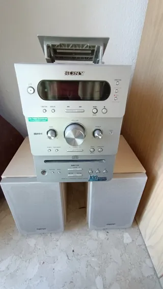 Mini cadena de audio Sony HCD-GPX7 con sus altavoces. - Unidad principal de audio. - Dos altavoces plateados. - Incluye cableado, antena, mando.