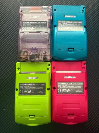 Se vende lote de cuatro consolas Game Boy Color. - Consola morada translúcida. - Consola azul. - Consola verde lima. - Consola rosa.( sonido bajo) Envio previo pago mas envio! Cualquier duda hazmela No hago cambios! Estan en bastante buen estado! Si las quieres sueltas estan en mi perfil