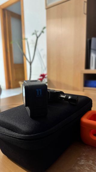 Conjunto de accesorios para GoPro 11. - Funda de transporte negra. - Carcasa naranja para buceo - Empuñadura negra y naranja. - tres baterias con cargador hub - Soporte negro para mejorar el sonido