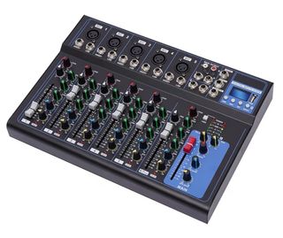 Mesa de mezclas de 7 canales con reproductor digital MP3. Mezclador pequeño de 7 canales, 7 mezcladores de audio estéreo, bajo ruido para una submezcla precisa, salida TRS ideal para micrófonos, mezclador de audio con entrada de 48 V de alimentación fantasma - Entradas MIC 1-5 con conectores XLR/TRS. - Entradas de línea y inserto. - Salidas principales. - Controles de ganancia, ecualización y faders.