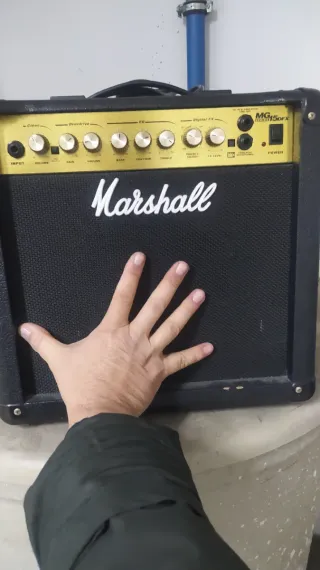 Amplificador Marshall MG15FX en color negro y dorado. Ideal para practicar. - Controles de Clean, Overdrive, EQ y Digital FX. - Conexión de entrada y salida de línea. - Salida para auriculares. La parte de los efectos no funciona por eso lo vendo barato . Lo demás suena genial y buen tono y Drive para estudiar en casa o local