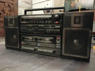 Tensai Ghettoblaster RCR 3431. Uno de los pocos modelos producidos por la compañía japonesa Tensai en Corea a principios de la década de 1980, con un aspecto típico de la época. Cuenta con una pletina de casete doble, un ecualizador de 3 bandas independiente para cada canal, una radio de 4 bandas y altavoces bidireccionales desmontables. La construcción es bastante sólida a pesar de estar hecha completamente de plástico, y suena bastante bien con buena potencia, con unos 8 vatios RMS por canal. Necesita revision interior, correas, limpieza potenciometros etc. Funciona