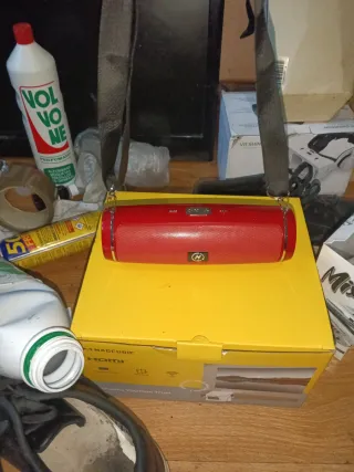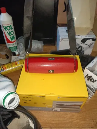 Barra de sonido portátil con conexión Bluetooth. - Diseño cilíndrico en color rojo. - Incluye correa para facilitar su transporte.