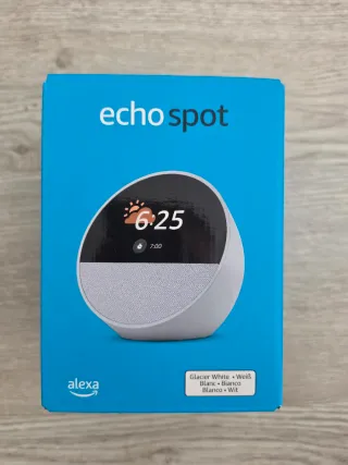 Altavoz inteligente Amazon Echo Spot en color Glacier White. Un dispositivo compacto con pantalla. - Pantalla circular. - Altavoz integrado. - Diseño moderno.