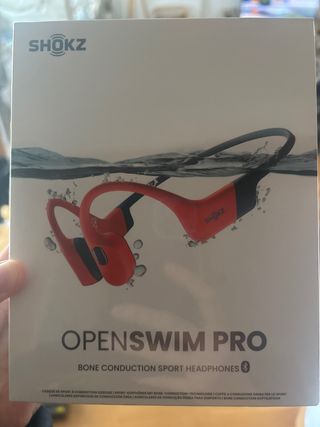 Auriculares Shokz OpenSwim Pro para deportes acuáticos. Diseñados para ofrecer una experiencia de audio inmersiva mientras nadas. - Tecnología de conducción ósea. - Resistentes al agua. - Color rojo y negro.