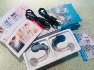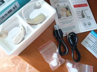 Este amplificador de sonido es discreto y fácil de usar. Incluye accesorios para un ajuste personalizado. - Dos unidades incluidas. - Cable de carga USB. - Tapones de oído de diferentes tamaños.