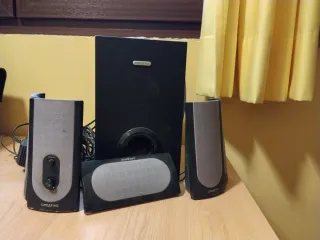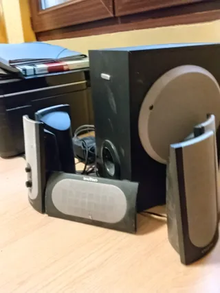 Vendo sistema de sonido 5.1 completo, ideal para cine en casa o para conectar a TV, proyector o PC. Incluye subwoofer amplificado, 5 altavoces satélite, altavoz central, cables de conexión, antena FM y mando a distancia.