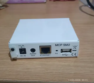 Reproductor de audio IP en acabado blanco. - Indicadores LED: ON, SP, NET, SD. - Ranura para tarjeta SD. - Puerto de conexión.