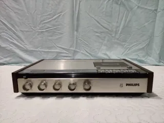 Reproductor de cassette estéreo de la marca Philips, modelo N2400,un equipo clásico con un diseño elegante de los años 1975-1977 - Acabado en plata y detalles en madera. - Controles frontales para funciones de audio.