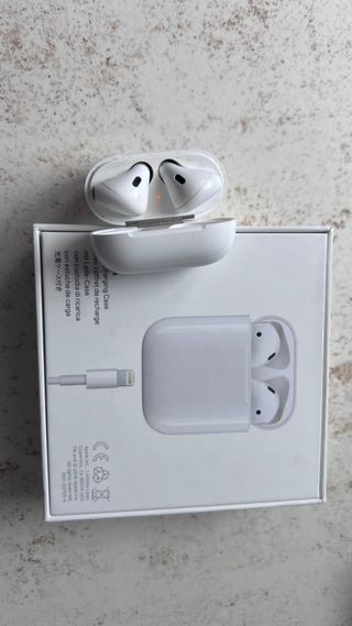 Auriculares inalámbricos Apple AirPods Pro. Con su caja. Algunas veces hace un ruidito el casco izquierdo que no se por que es, de ahi su precio, pero funcionan perfectamente. Los vendo porque me han regalado unos nuevos. Gomas de repuesto y cable sin estrenar. - Estuche de carga. - Indicador LED de estado.