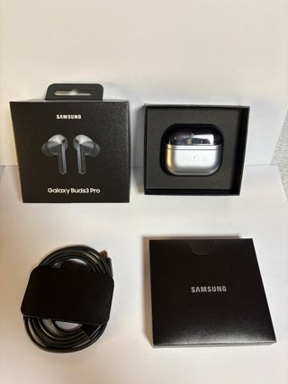 Auriculares inalámbricos Samsung Galaxy Buds 3 Pro. - Incluye estuche de carga plateado y el cable de carga USB-C original sin estrenar. - Folleto de información de samsung. - Almohadillas intercambiables talla S y L. Talla M las lleva puesta. - Vendo por cambiar a sistema iOS. - Fecha de compra Julio 2024. - Regalo dos fundas.