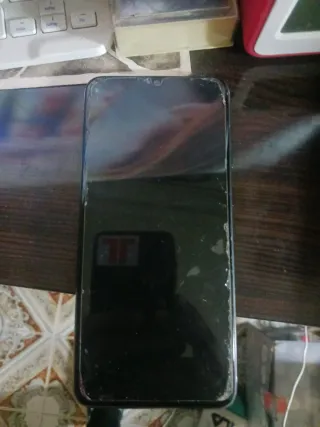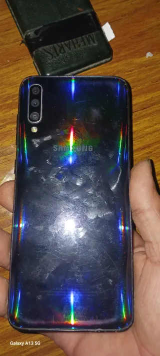 Teléfono Samsung A50 para piezas o para quien quiera repararlo. El dispositivo tiene un acabado negro con reflejos multicolores. El teléfono enciende y da sonido pero no imagen habría que cambiar la pantalla
