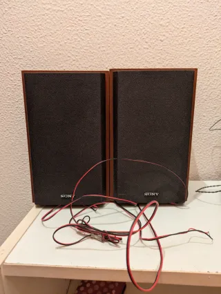 Sistema de audio Sony con varios componentes. Se incluyen cables de conexión y antena. - Unidad principal con radio. - Reproductor de CD. - Doble pletina de casete. - Altavoces. - Subwoofers. Funcionan correctamente ambos altavoces. Si necesitas más detalles escríbeme.