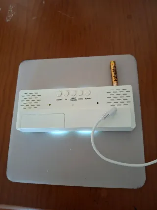 Despertador digital con un diseño moderno y elegante. - Botones de control: DOWN, UP, LIGHT/SNOOZE, MODE, ALARM. - Compartimento para pilas.