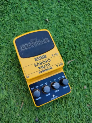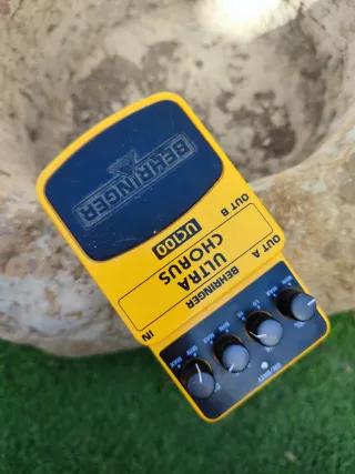 Pedal de efectos Behringer UC100. - Color amarillo. - Controles de nivel, modo (HI/LO) y velocidad. - Entradas y salidas IN, OUT A, OUT B. - Indicador ON/BATT.