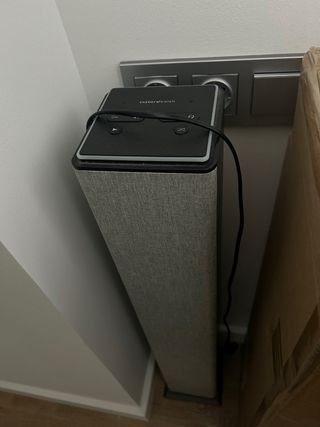 Torre de sonido con un diseño moderno y elegante. - Acabado en tela gris. - Base negra.