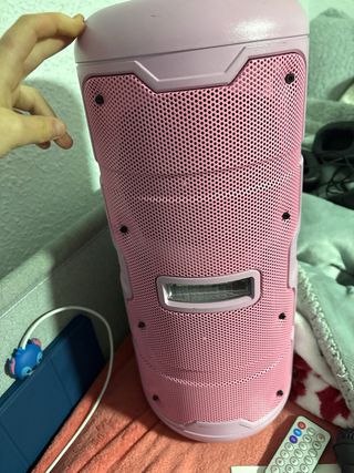 Altavoz portátil de color rosa con asa para facilitar su transporte. Incluye micrófono y mando a distancia. - Asa superior. - Micrófono con cable. - Mando a distancia.