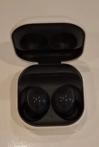 Auriculares inalámbricos Samsung Galaxy Buds2 en color gris oscuro. - Diseño ergonómico para un ajuste cómodo. - Sonido de alta calidad. - Estuche en perfectas condiciones y funcionando. - Auricular derecho en perfecto estado y funcionando. - Auricular izquierdo no funciona pues lo lavé en la lavadora sin querer.