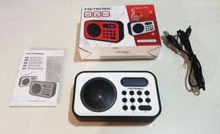 FUNCIONES RADIO: - Sintonizador digital AM/FM - Búsqueda y memorización emisoras manual o automática - Memoria hasta 50 presintonías - Antena extensible FUNCIONES RELOJ/DESPERTADOR: - Formato 12/24 horas - 2 opciones alarma: radio y buzzer - Paro de alarma temporal (10 minutos) o definitivo (hasta siguiente día) - Memoria hasta 50 presintonías CARACTERÍSTICAS TÉCNICAS: - Batería litio 3.7 V recargable y extraíble - Autonomía 10 horas - Incluye cable de carga USB - También funciona con 3 pilas AAA - Salida auricular JACK 3.5 m - Tamaño: 12,5x7x3 - Incluye manual de instrucciones Nuevo A ESTRENAR. Sólo abierto para fotos.