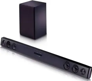 Sistema de sonido LG SQC2 en color negro. - Barra de sonido delgada y elegante. - Subwoofer compacto.