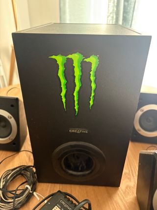 Sistema de altavoces Creative 5.1 con un diseño moderno y el icónico logo de Monster Energy en el subwoofer. - Subwoofer central negro con logo verde. - Cinco altavoces satélite negros con detalles plateados. - Incluye fuente de alimentación.
