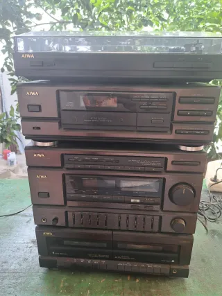Sistema de sonido Aiwa en color marrón y negro. - Necesita una revisión - Plato giradiscos. - Reproductor de CD. - Sintonizador de radio. - Doble pletina de casete. - Ecualizador gráfico.