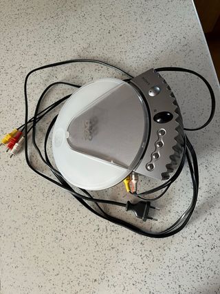 Reproductor de DVD portátil en color plata y negro. Ideal para llevar contigo. - Diseño compacto y ligero. - Incluye cables de conexión.