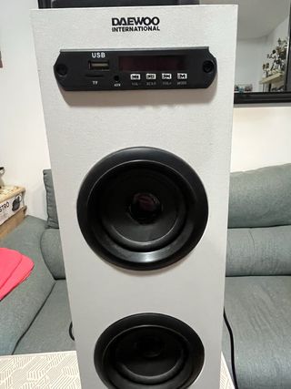 Torre de sonido marca Daewoo, modelo DSK-515W. - Diseño moderno y elegante. - Panel frontal con pantalla LED. - Puertos USB y TF para reproducción de música. - Botones de control de volumen, escaneo y modo.