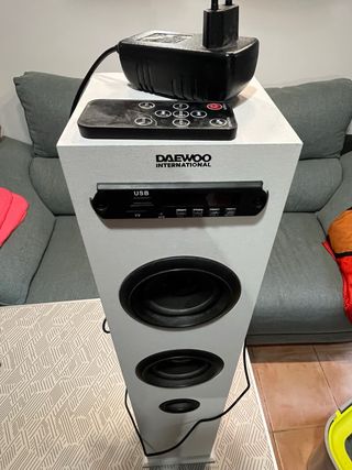 Torre de sonido Daewoo International en color blanco. Incluye mando a distancia y adaptador de corriente. - Diseño vertical. - Múltiples altavoces.