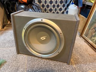 Caja de subwoofer con un diseño moderno y elegante. - Acabado exterior en color gris. - Aro frontal plateado. Medidas: Largo 50 cm Ancho abajo 23 cm arriba 17 cm Alto 38 cm