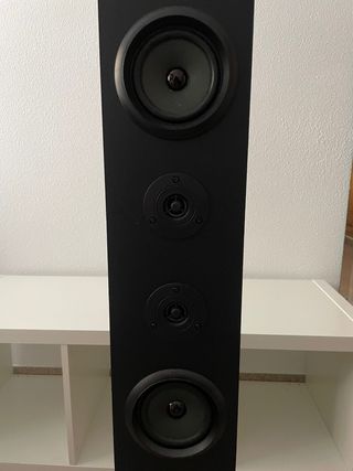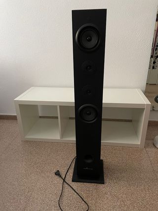 Torre de sonido con un diseño moderno y elegante. - Altavoz principal en la parte inferior. - Dos altavoces secundarios en la parte superior. - Panel de control táctil en la parte superior.