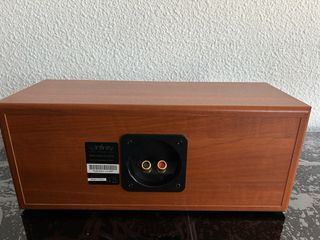 Altavoz central de la marca Infinity, modelo Primus. Presenta un diseño elegante con acabados en madera y detalles en gris. - Dos altavoces. - Tweeter central. El central es el 70 por coen del sonido, pon uno de calidad