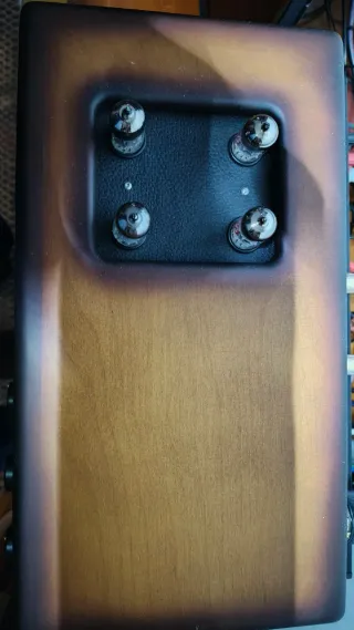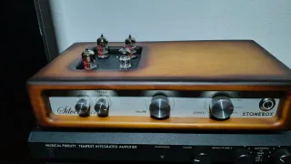 Amplificador Xtonebox Silver 6011 con un diseño elegante que combina madera y metal. - Acabado en tonos marrones y plateados. - Incorpora válvulas visibles en la parte superior. - Panel frontal con controles de Bass, Treble, Volume y Source. - Conexiones Aux 1, Aux 2 y Phono.