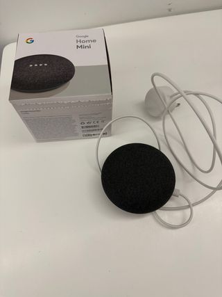 Altavoz inteligente Google Home Mini en color gris carbón. Compacto y con un diseño moderno. - Diseño redondo y discreto. - Cubierta de tela. - Cable de alimentación incluido.