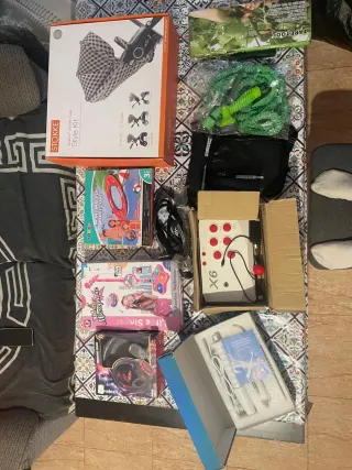 Se vende un lote variado de artículos, ideal para renovar tu hogar o para quienes buscan electrónica útil. - Cesta organizadora de plástico verde. - Lámpara LED UV X7 MAX. - Antena DVB-T. - Ventilador de aspas negro. - Soporte para TV o monitor. - Enchufe y otros accesorios electrónicos.