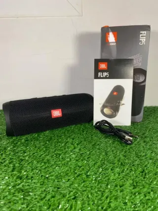 Altavoz portátil JBL Flip 5 en color negro. Incluye cable de carga y manual. - Diseño compacto y resistente. - Sonido potente y nítido.
