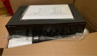 Amplificador mezclador Optimus en color negro. Nuevo. - Modelo: A-5240Z6N - Controles de volumen para Master, Treble, Bass, Aux2, Aux1, Mic3, Mic2, Mic1. - Interruptor de encendido/apagado. 240W • 3 entradas de micrófono, 2 entradas de auxiliar y una salida auxiliar para interconexión de equipos. • Salida general de altavoces para línea de 100 V, 70 V y 8 Ω • 6 salidas de zonas para línea de 100 V. • Función de mute en la entrada MIC1 que actúa sobre el resto de las entradas (prioridad). • Control de volumen independiente para cada entrada. • Controles de tono; agudos y graves. • Vúmeter para supervisión del nivel de señal.